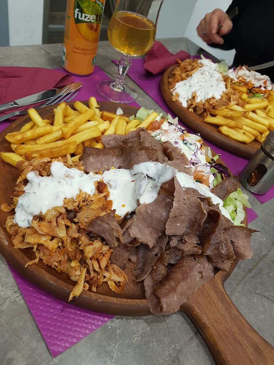 The menu is diverse, featuring kebabs made with beef or chicken, alongside tacos, pizza, and fast-food staples. Popular choices include the yufka wraps and mixed chicken-beef options served with fries, which offer generous portions at wallet-friendly prices. This mix of cuisines suits groups with different tastes or anyone looking for a quick satisfying meal without fuss.